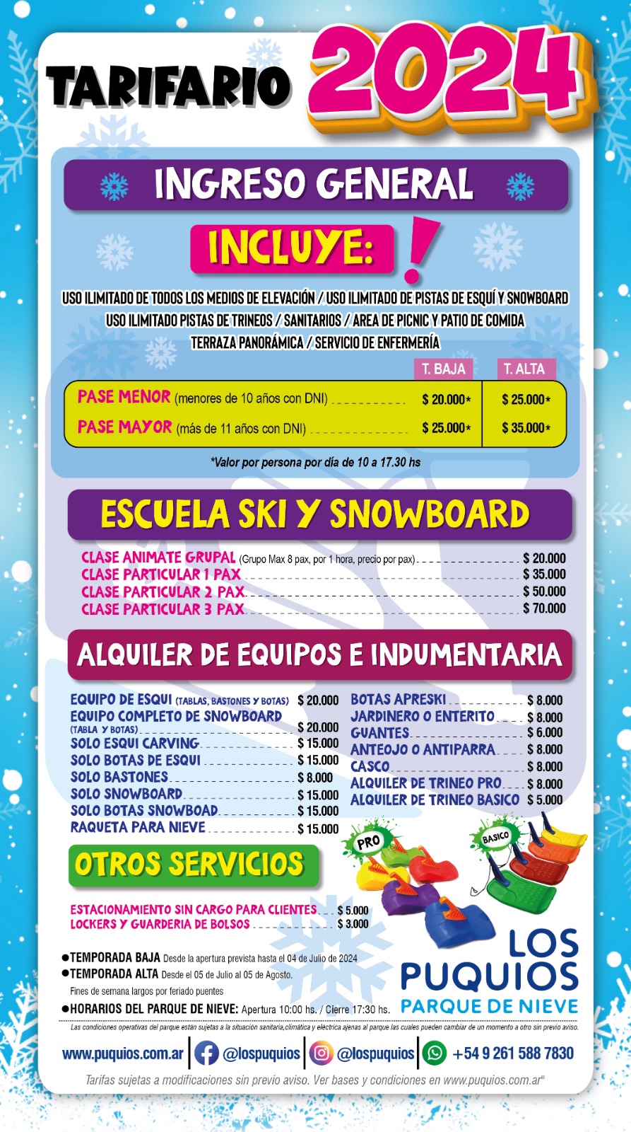 LOS PUQUIOS: -Si las nevadas y el tiempo lo permite, el 16/06/24 se prevee la apertura. El centro de ski en Mendoza Los Puquios está en la Ruta Nacional Nro. 7, km 1217 de Puente del Inca, a 5 km de la Villa de Puente del Inca. Teléfono WhatsApp (solo mensajes) +54 9 261 588-7830, la página web es https://puquios.com.ar/, también podes seguirlos en Instagram https://bit.ly/3jzkgc9 o escribirles al whatsapp +54 9 2615 88-7830.